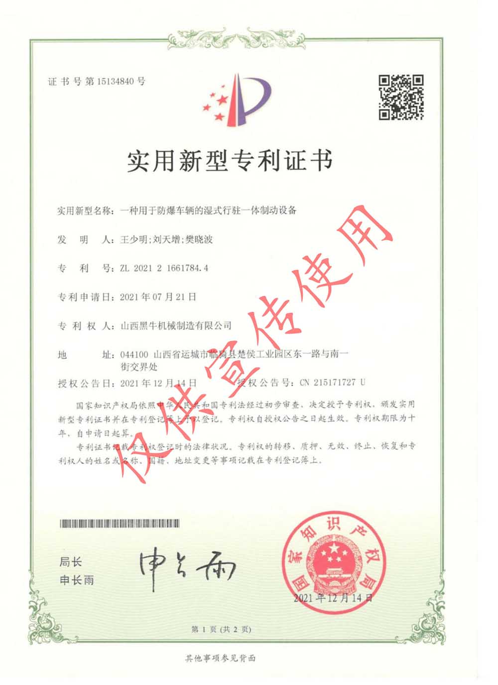 實(shí)用型專利證書(shū)