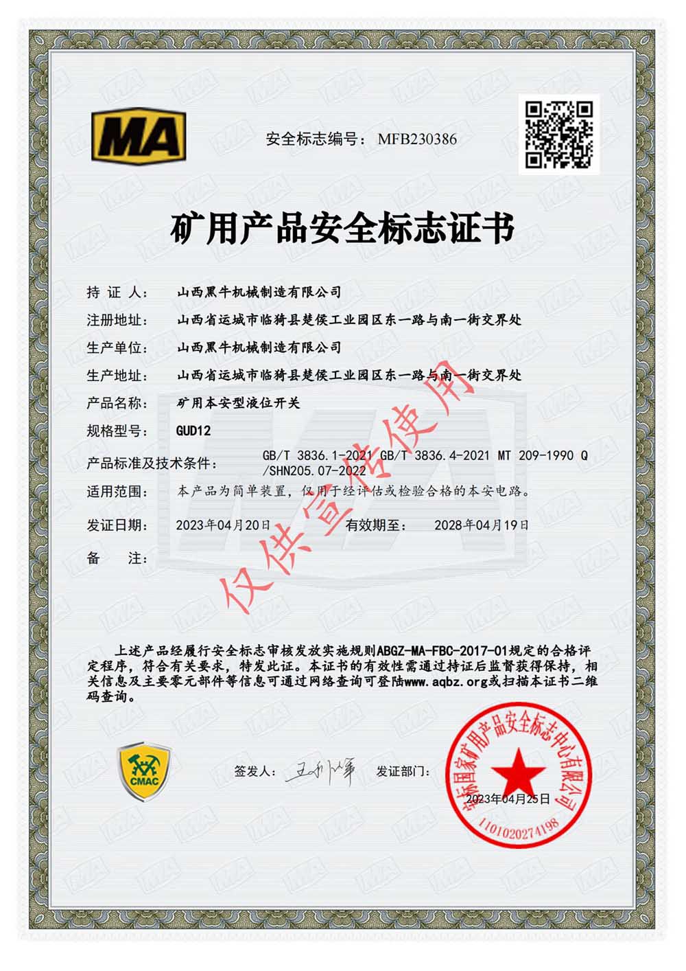 礦用本安型液位開(kāi)關(guān)安標(biāo)證